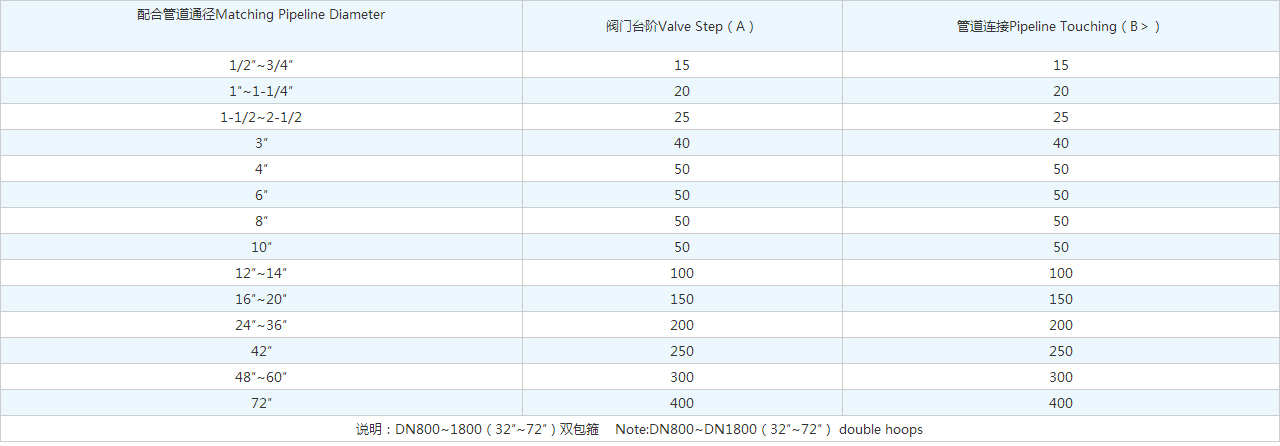 | 配合管道通徑Matching Pipeline Diameter | 閥門臺階Valve Step(A) | 管道連接Pipeline Touching(B>) |